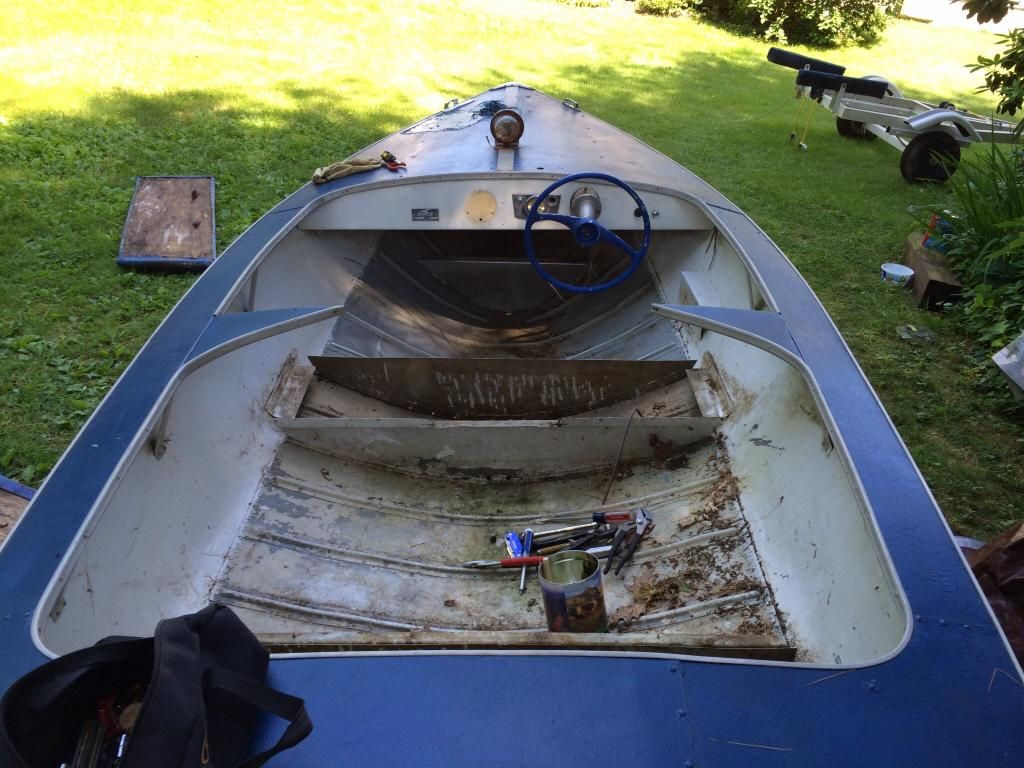Hello All So I just picked up this old girl with the intention of bringing her back to life. She is a 1959 Duratech Sealine model S148. She came with the original Evinrude 35 HP outboard. Hard to say if it is salvageable at this point. This will be my first boat restoration so I would appreciate as much feedback as possible. She has a few dents in the bottom hull, but nothing that can't be at least partially knocked out. Rivets look good, but hard to say at this point. Planning on removing all the hardware and stripping the paint first. First question is the possible removal of the epoxy paint on the deck. Is there a stripper that will pull that off or will it require blasting? What stripper do you recommend for aluminum? Is there an environmentally friendly option in a chemical stripper? I plan on posting pics of my progress. For some reason I got an error trying to attach a pic to this post. The interior stripping will be more challenging working around the deck supports on the perimeter and stern. All part of the fun. Next question, is it necessary to polish the aluminum before priming and painting or is stripping and cleaning enough. I hope to learn a lot as I go from the group here. I will need your experience to make this a success. Thanks in advance for the feedback and advice.