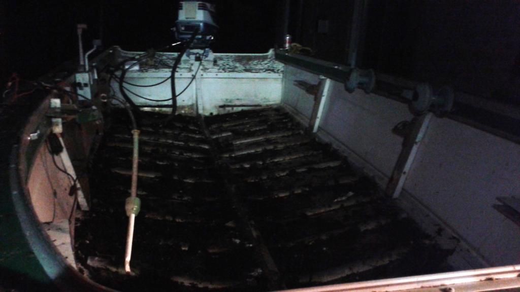 I recently acquired a 14' 6" Sylvan Seaman that needs some serious TLC. The hull is in great condition with only very minor scrapes. No dents, no broken rivets and no leaks. The floor and all other wood was completely rotted and needed to be removed. The electrical, steering system, and helm components all need to be replaced as well. The motor appears to be in great condition, however, I will not know if it runs until I can replace the power cables.