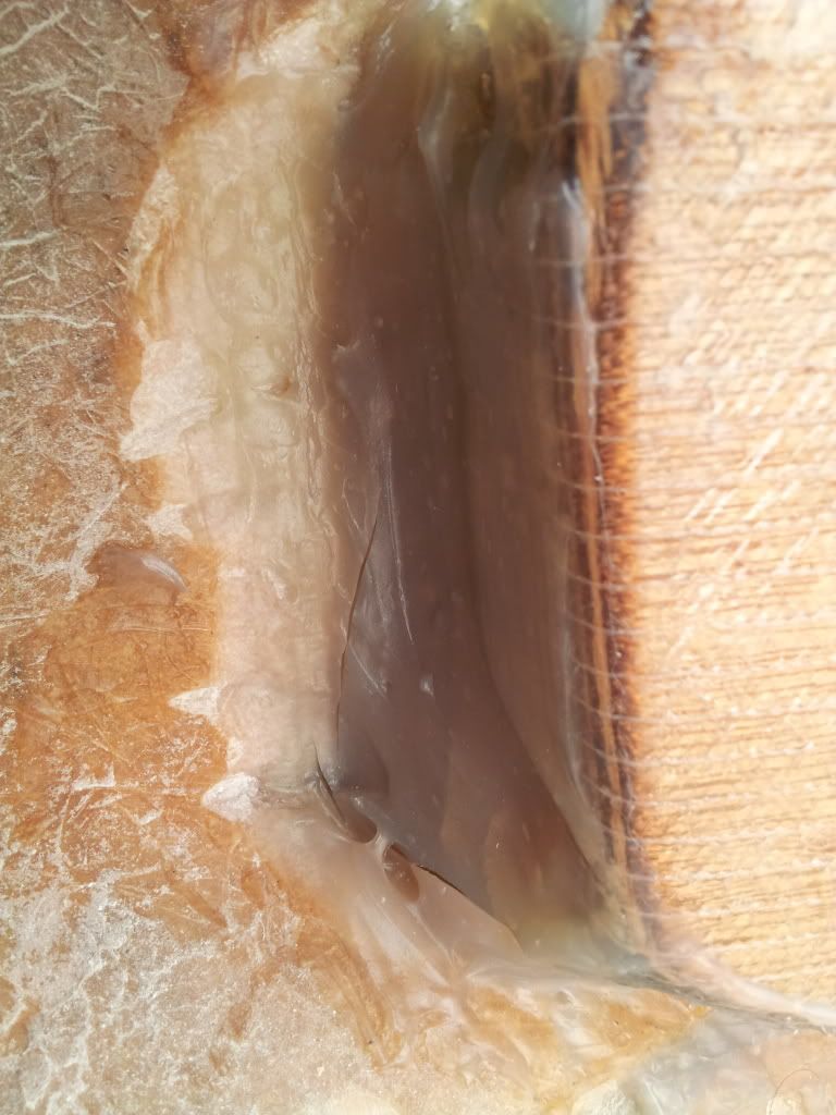 I think the 'wrong' mix of poly resin & filler was used. Although Cabosil & resin will make a filler, it is 'thin' and better suited to filling small areas: chips and dings, not large, deep & wide areas adjacent to the transom ply. Typically, 'hairy' PB is used for structural applications, and filleting the transom ply would definitely be structural, IMHO.