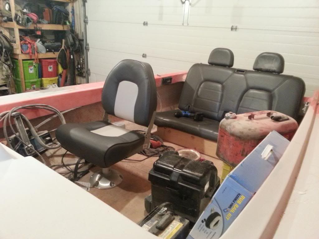 Honestly the more I work on this boat, the more I love it. Its so small that it easily fits in my garage with room to spare. With all the seats installed it has plenty of interior space. The rear seat folds down for storage of life jackets, fishing rods etc under the splashwell. And by the time Im done it will essentially be a brand new boat. The trailer will need some TLC however. I still need to figure out carpet too. I dont want too dark of a color because I'll bake in the sun. Maybe match the light grey in the front seat as closely as possible?